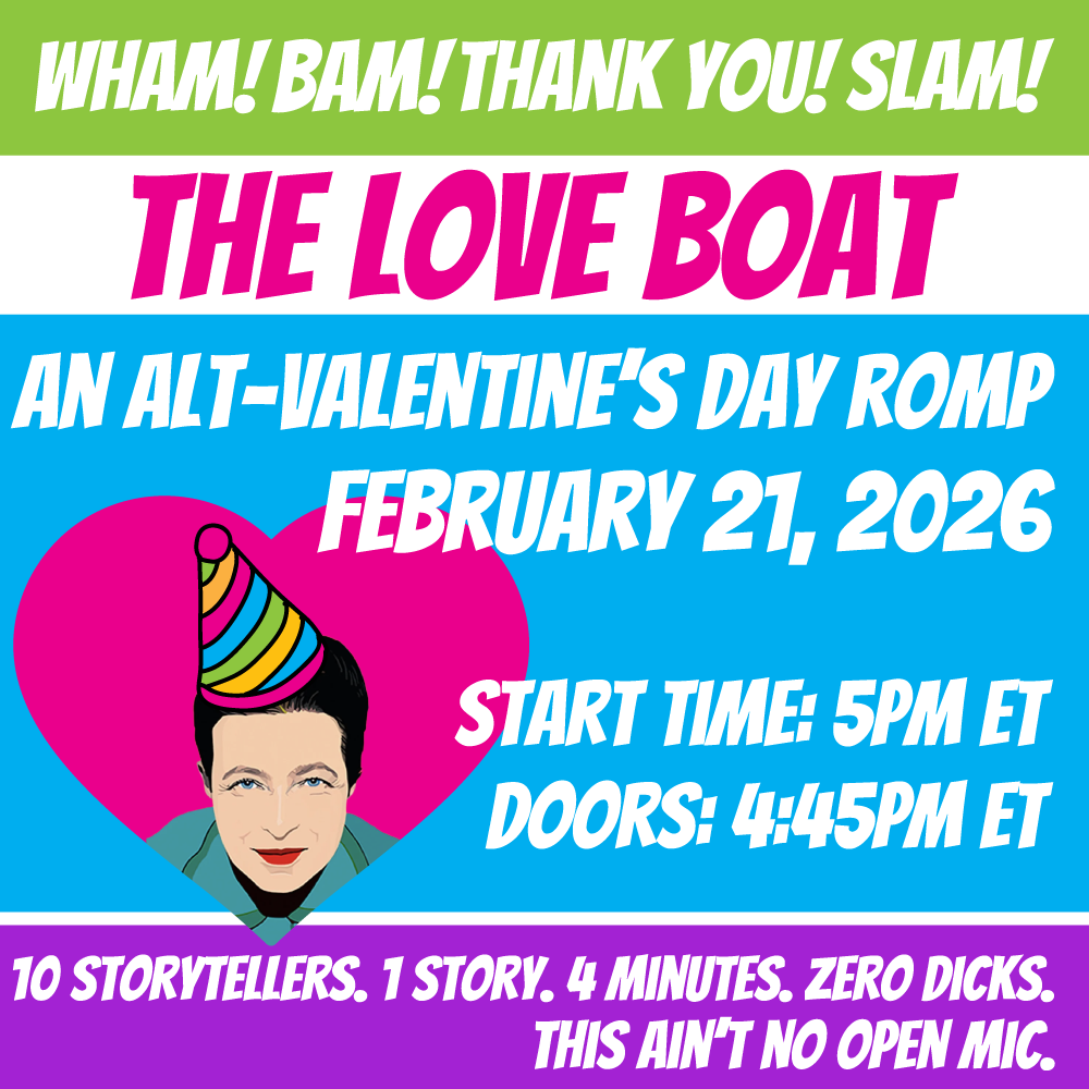 Tickets are on sale our February slam, The Love Boat. It’s an alt-Valentine’s Day event. Ticketing and Zoom registration, streamlined for ease.